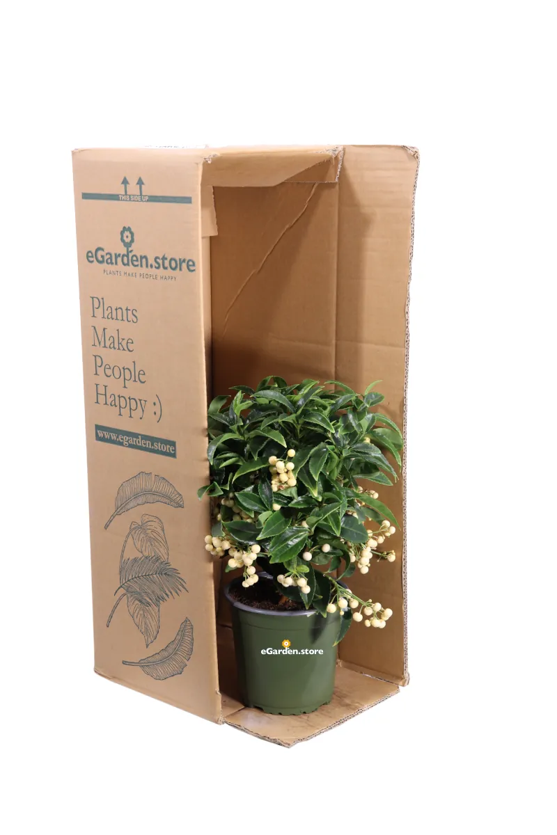 L’Ardisia Crenata Bospremium White è una pianta perenne da interno originaria dell’Asia orientale ed appartenente alla famiglia delle Primulaceae. E’ un piccolo arbusto sempreverde che si sviluppa poco oltre il metro di altezza ed ha portamento cespitoso formata da un unico fusto; è dotata di fitte foglie a forma lanceolata ed appuntite, di colore verde scuro con una venatura centrale e con bordi leggermente frastagliati. La fioritura avviene alla fine della primavera ed inizio estate generando piccoli fiori bianchi a forma di stella riuniti in grappoli a cui fanno seguito in autunno i frutti che si presentano come bacche che in piena maturazione assumono tonalità di bianco tendente al giallo e che perdurano sino alla fioritura successiva. L’Ardisia è una pianta a crescita lenta che non richiede molte cure, ideale da coltivare in contenitore per arredare sia casa per ufficio grazie alle sue bacche persistenti; predilige il posizionamento in luoghi luminosi evitando i raggi diretti del sole, adattandosi a zone di ombra parziale. Il terreno che si consiglia per questa pianta deve essere fertile e ben drenato da mantenere sempre umido con irrigazioni periodiche soprattutto nei periodi più caldi, evitando i ristagni.